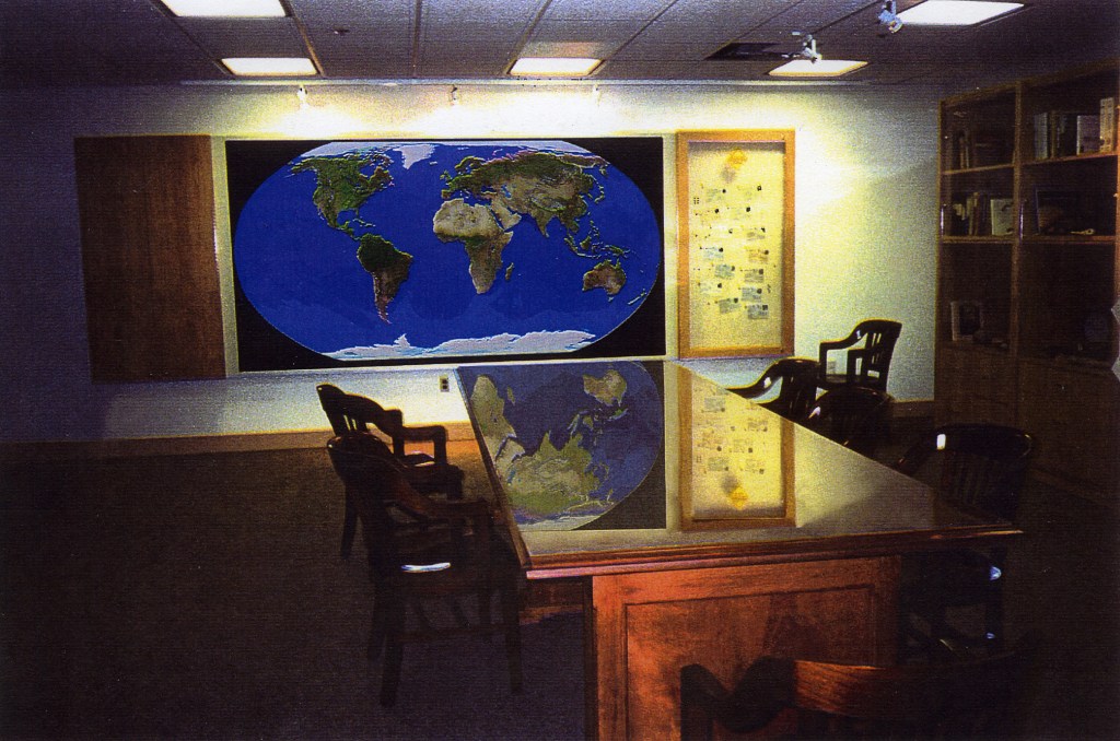 The work required one year of effort by Van Sant and his technical team using the world’s most powerful graphics computers. In 1988 during the height of the Cold War, every boardroom and schoolroom in the world displayed maps and globes of the world with every country a different color. This was also a time of environmental crisis of great proportions: extinction of species, industrial poisoning of rivers and lakes worldwide, and depletion of ozone protection in the atmosphere. No one knew what the world, their home and place in space truly looked like.
